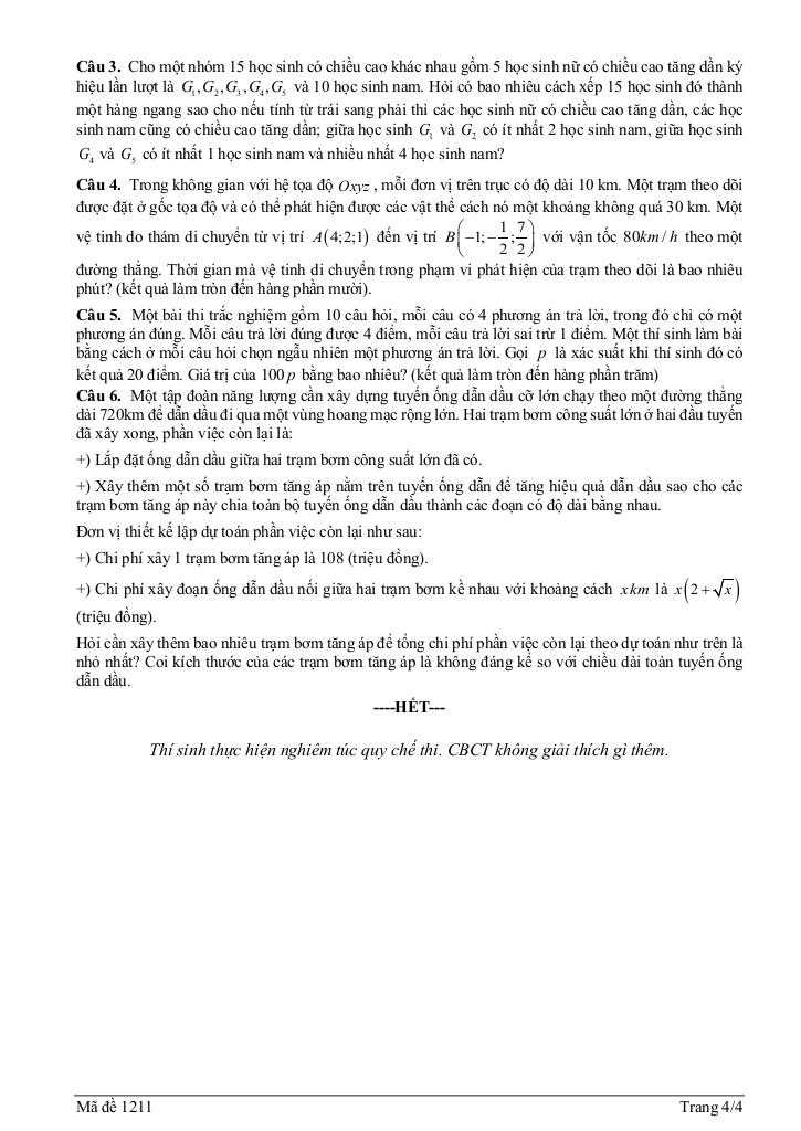 + Một tập đoàn năng lượng cần xây dựng tuyến ống dẫn dầu cỡ lớn chạy theo một đường thẳng dài 720km để dẫn dầu đi qua một vùng hoang mạc rộng lớn. Hai trạm bơm công suất lớn ở hai đầu tuyến đã xây xong, phần việc còn lại là: +) Lắp đặt ống dẫn dầu giữa hai trạm bơm công suất lớn đã có. +) Xây thêm một số trạm bơm tăng áp nằm trên tuyến ống dẫn để tăng hiệu quả dẫn dầu sao cho các trạm bơm tăng áp này chia toàn bộ tuyến ống dẫn dầu thành các đoạn có độ dài bằng nhau. Đơn vị thiết kế lập dự toán phần việc còn lại như sau: +) Chi phí xây 1 trạm bơm tăng áp là 108 (triệu đồng). +) Chi phí xây đoạn ống dẫn dầu nối giữa hai trạm bơm kề nhau với khoảng cách x km là x(2 + √x) (triệu đồng). Hỏi cần xây thêm bao nhiêu trạm bơm tăng áp để tổng chi phí phần việc còn lại theo dự toán như trên là nhỏ nhất? Coi kích thước của các trạm bơm tăng áp là không đáng kể so với chiều dài toàn tuyến ống dẫn dầu.