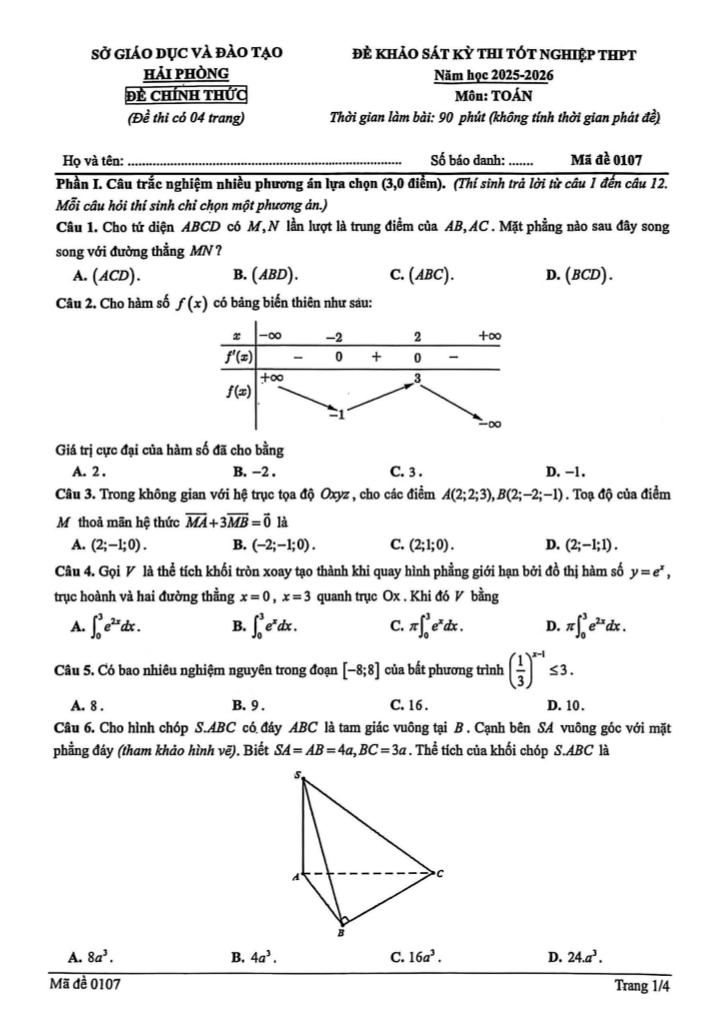 Trích dẫn Đề khảo sát thi tốt nghiệp THPT 2026 môn Toán sở GD&ĐT Hải Phòng: