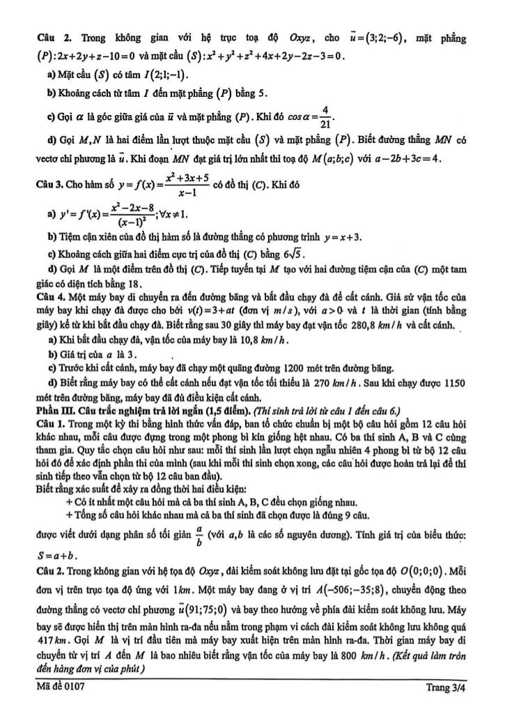 + Trong một kỳ thi bằng hình thức vấn đáp, ban tổ chức chuẩn bị một bộ câu hỏi gồm 12 câu hỏi khác nhau, mỗi câu được đựng trong một phong bì kín giống hệt nhau. Có ba thí sinh A, B và C cùng tham gia. Quy tắc chọn câu hỏi như sau: mỗi thí sinh lần lượt chọn ngẫu nhiên 4 phong bì từ bộ 12 câu hỏi đó để xác định phần thi của mình (sau khi mỗi thí sinh chọn xong, các câu hỏi được hoàn trả lại để thí sinh tiếp theo vẫn chọn từ bộ 12 câu ban đầu). Biết rằng xác suất để xảy ra đồng thời hai điều kiện: + Có ít nhất một câu hỏi mà cả ba thí sinh A, B, C đều chọn giống nhau. + Tổng số câu hỏi khác nhau mà cả ba thí sinh đã chọn được là đúng 9 câu; được viết dưới dạng phân số tối giản a/b (với a, b là các số nguyên dương). Tính giá trị của biểu thức: S = a + b.
