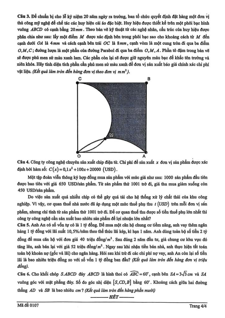 + Để chuẩn bị cho lễ kỷ niệm 20 năm ngày ra trường, ban tổ chức quyết định đặt hàng một đơn vį thủ công mỹ nghệ để chế tác các huy hiệu cài áo đặc biệt. Huy hiệu được thiết kế trên một phôi bạc hình vuông ABCD có cạnh bằng 20 mm. Theo bản vẽ kỹ thuật từ các nghệ nhân, cấu trúc của huy hiệu được phân chia như sau: lấy một điểm M được xác định bên trong phôi bạc sao cho khoảng cách từ M đến cạnh dưới OA là 4mm và cách cạnh bên trái OC là 8mm, cạnh vòm là một cung tròn đi qua ba điểm O, M, C; đường lượn là một phần của đường Parabol đi qua ba điểm O, M, A. Phần tô đậm trong bản vẽ sẽ được phủ men sứ màu xanh lam. Các phần còn lại sẽ được giữ nguyên màu bạc để khắc tên trường và niên khóa. Hãy tính diện tích phần cần phủ men sứ màu xanh để đơn vị sản xuất báo giá chính xác chi phí vật liệu. (Kết quả làm tròn đến hàng đơn vị theo đơn vị mm²).