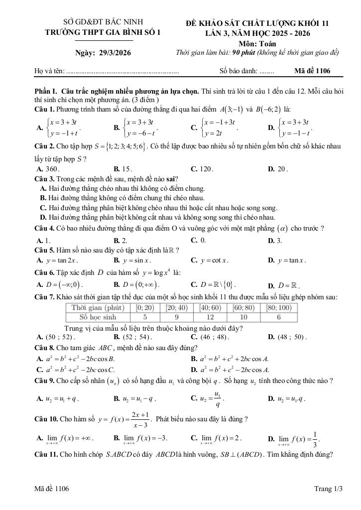 Trích dẫn Đề khảo sát Toán 11 lần 3 năm 2025 – 2026 trường THPT Gia Bình 1 – Bắc Ninh: