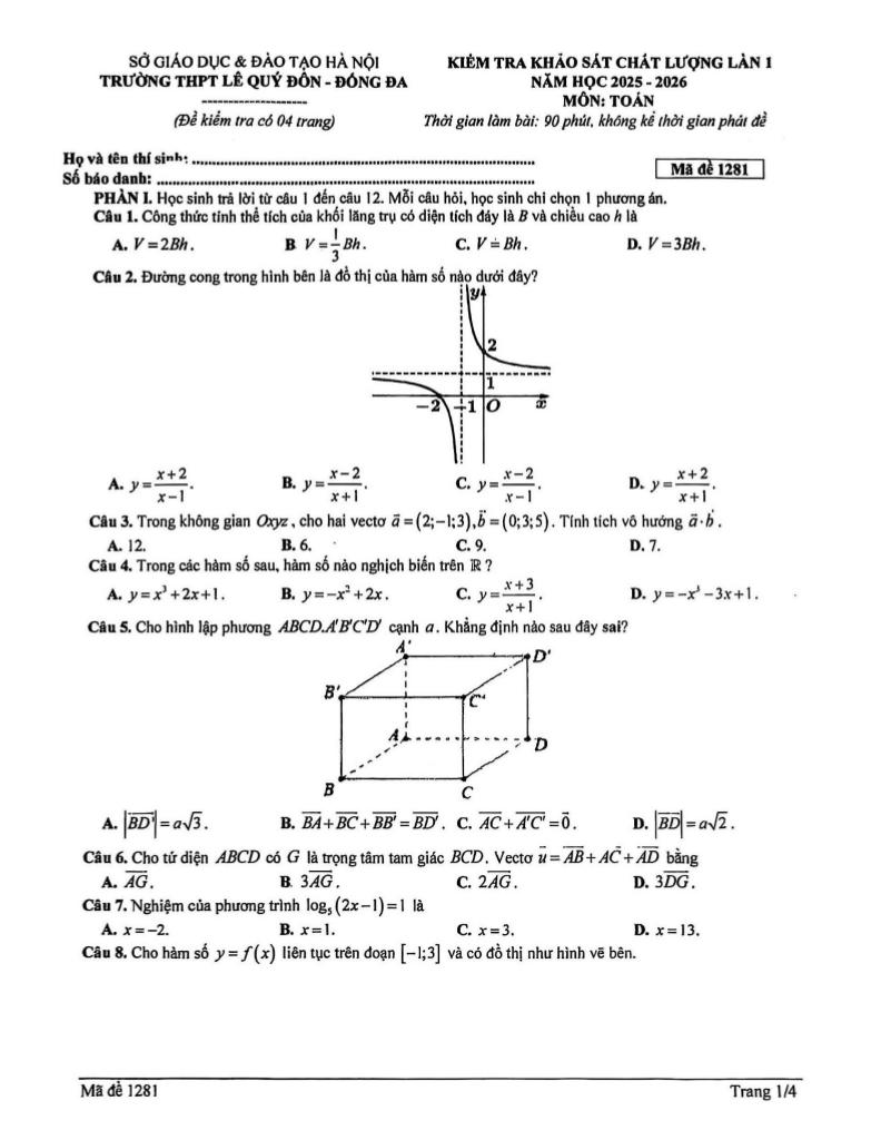 Giải Toán đề khảo sát toán 12 lần 1 năm 2025 – 2026 trường thpt lê quý đôn – hà nội với Đáp Án Mới Nhất