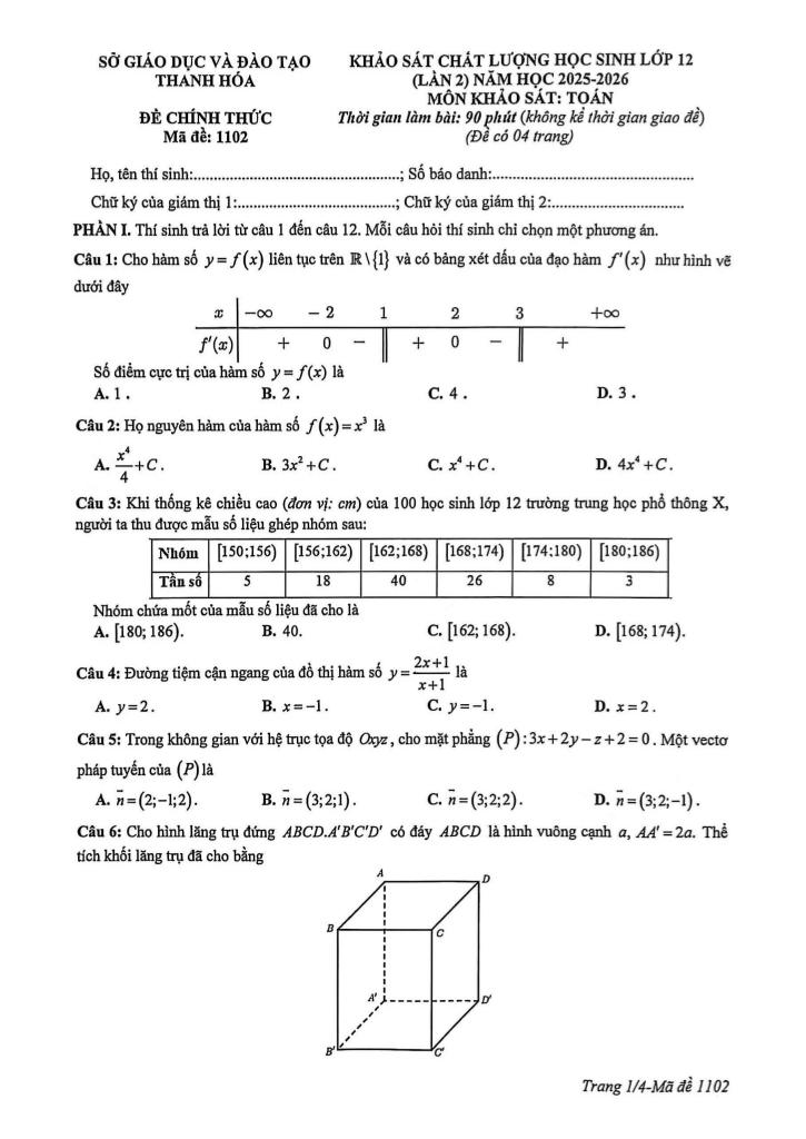 Trích dẫn Đề khảo sát Toán 12 lần 2 năm 2025 – 2026 sở GD&ĐT Thanh Hóa: