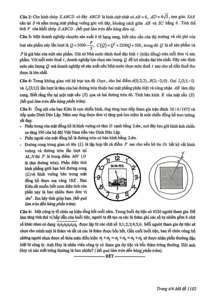 + Ông nội của bạn Kiên là cựu chiến binh, ông từng trực tiếp tham gia trận đánh 30/4/1975 và tiếp quản Dinh Độc Lập. Năm nay ông được đơn vị tặng quà lưu niệm là một chiếc đồng hồ treo tường rất đẹp. Phần trong của mặt đồng hồ là hình vuông có tâm O cạnh bằng 2 dm, nơi đây lưu giữ hình ảnh chiếc xe tăng 390 của bộ đội Việt Nam tiến vào Dinh Độc Lập. Phần ngoài của mặt đồng hồ là đường tròn có bán kính bằng 2 dm. Đường cong trung gian có tên (L) là tập hợp tất cả điểm P sao cho nếu kẻ tia Ot bất kỳ cắt hình vuông và đường tròn lần lượt tại M, N thì P là trung điểm MN (O là tâm đường tròn). Phần diện tích hình phẳng giới hạn bởi đường cong (L) và hình vuông bên trong mặt đồng hồ được mạ vàng 18K. Bạn Kiên rất muốn biết xem diện tích của phần này là bao nhiêu theo đơn vị dm2. Em hãy tính giúp bạn (kết quả làm tròn đến hàng phần trăm).
