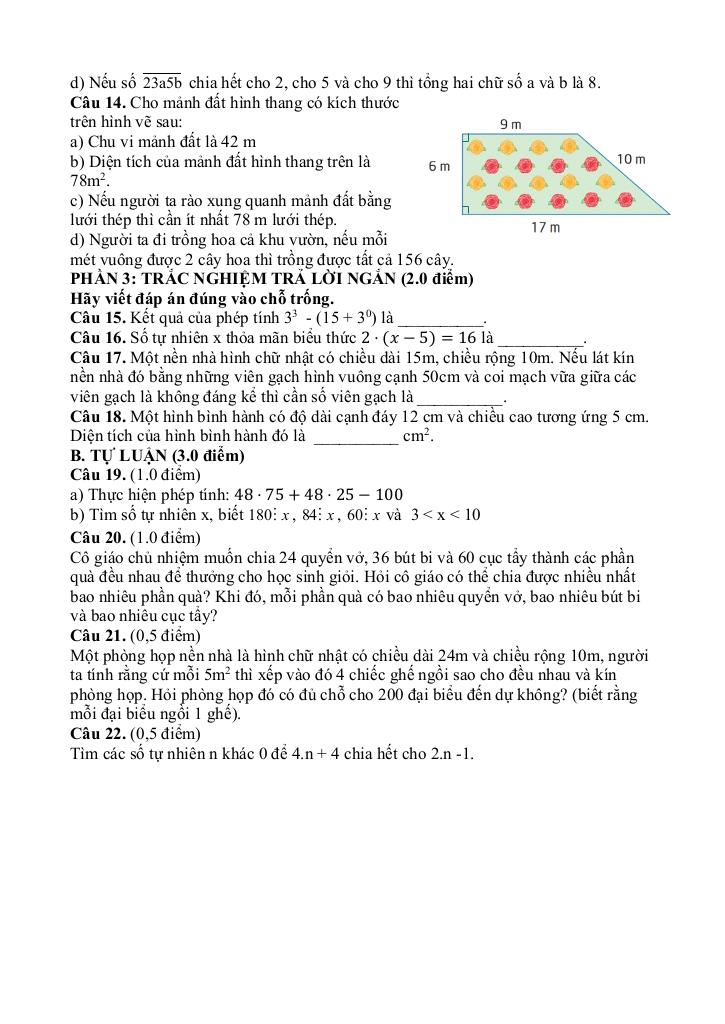 + Cho mảnh đất hình thang có kích thước trên hình vẽ sau: a) Chu vi mảnh đất là 42 m. b) Diện tích của mảnh đất hình thang trên là 78m2. c) Nếu người ta rào xung quanh mảnh đất bằng lưới thép thì cần ít nhất 78 m lưới thép. d) Người ta đi trồng hoa cả khu vườn, nếu mỗi mét vuông được 2 cây hoa thì trồng được tất cả 156 cây.