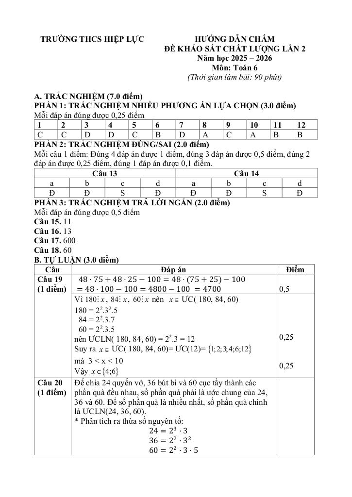giaitoan.edu.vn giới thiệu đến quý thầy, cô giáo và các em học sinh đề khảo sát chất lượng môn Toán 6 lần 2 năm học 2025 – 2026 trường THCS Hiệp Lực, xã Ninh Giang, thành phố Hải Phòng. Đề thi gồm 12 câu trắc nghiệm nhiều phương án lựa chọn (3,0 điểm) + 02 câu trắc nghiệm đúng sai (2,0 điểm) + 04 câu trắc nghiệm trả lời ngắn (2,0 điểm) + 04 câu tự luận (3,0 điểm), thời gian làm bài 90 phút, có đáp án và hướng dẫn chấm điểm.