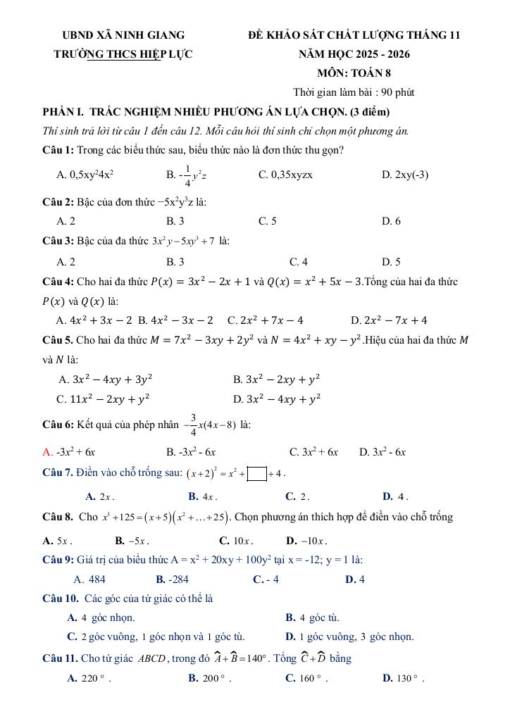 giaitoan.edu.vn giới thiệu đến quý thầy, cô giáo và các em học sinh đề khảo sát chất lượng môn Toán 8 tháng 11 năm học 2025 – 2026 trường THCS Hiệp Lực, xã Ninh Giang, thành phố Hải Phòng. Đề thi gồm 12 câu trắc nghiệm nhiều phương án lựa chọn (3,0 điểm) + 02 câu trắc nghiệm đúng sai (2,0 điểm) + 04 câu trắc nghiệm trả lời ngắn (2,0 điểm) + 02 câu tự luận (3,0 điểm), thời gian làm bài 90 phút, có đáp án và hướng dẫn chấm điểm.