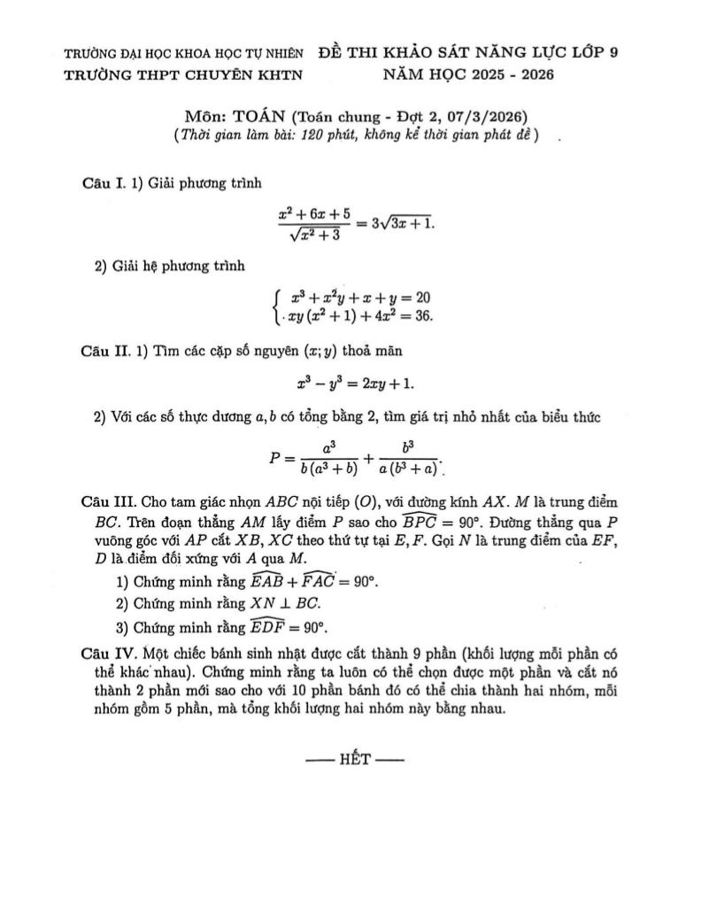 Trích dẫn Đề khảo sát Toán 9 (chung) đợt 2 năm 2025 – 2026 trường chuyên KHTN – Hà Nội: