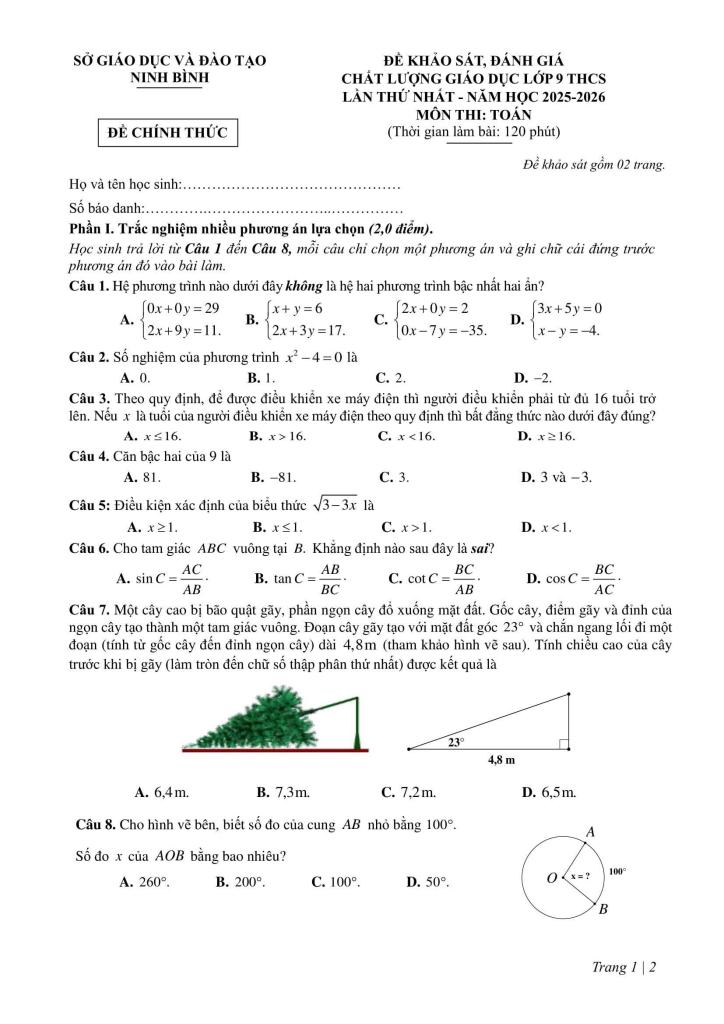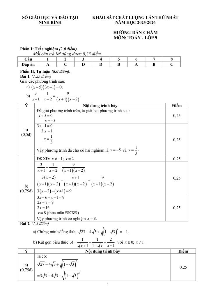Trích dẫn Đề khảo sát Toán 9 lần 1 năm 2025 – 2026 sở GD&ĐT Ninh Bình: