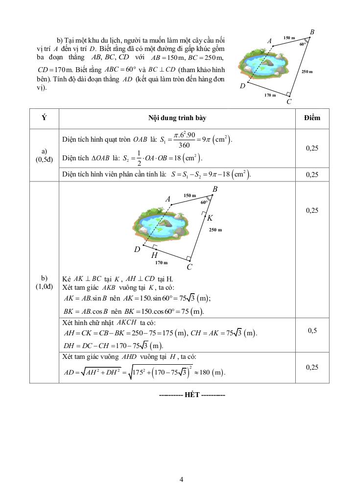 + Tại một khu du lịch, người ta muốn làm một cây cầu nối vị trí A đến vị trí D. Biết rằng đã có một đường đi gấp khúc gồm ba đoạn thẳng AB, BC, CD với AB = 150m, BC = 250m, CD = 170m. Biết rằng ABC = 60 và BC vuông góc CD (tham khảo hình bên). Tính độ dài đoạn thẳng AD (kết quả làm tròn đến hàng đơn vị).