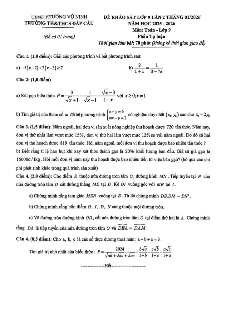 Trích dẫn Đề khảo sát Toán 9 lần 2 năm 2025 – 2026 trường TH&THCS Đáp Cầu – Bắc Ninh:
