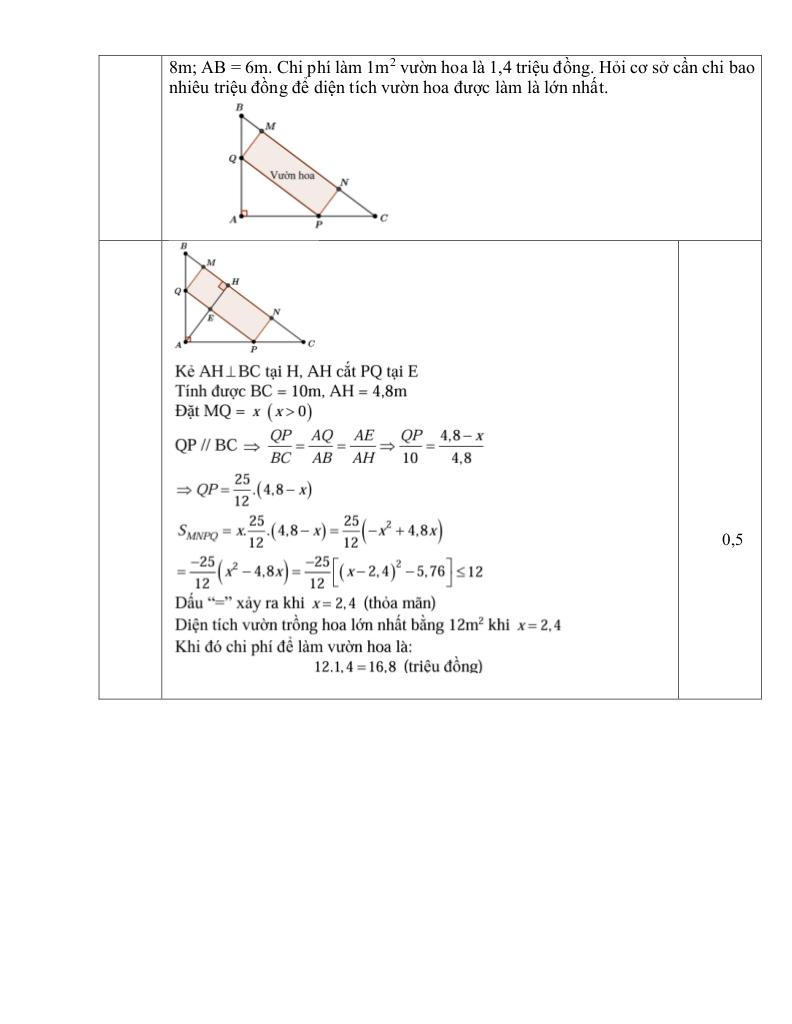 + Một cơ sở khảo sát để làm một vườn hoa hình chữ nhật MNPQ trên khu đất hình tam giác ABC vuông tại A nằm ở góc khuôn viên. Biết AC = 8m; AB = 6m. Chi phí làm 1m2 vườn hoa là 1,4 triệu đồng. Hỏi cơ sở cần chi bao nhiêu triệu đồng để diện tích vườn hoa được làm là lớn nhất.