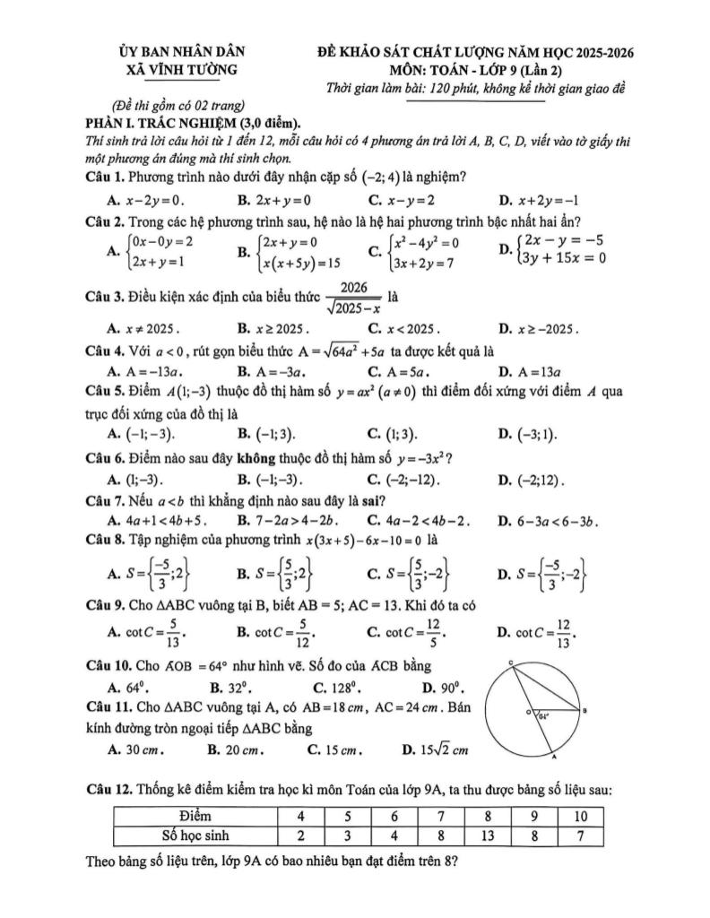 Trích dẫn Đề khảo sát Toán 9 lần 2 năm 2025 – 2026 xã Vĩnh Tường – Phú Thọ: