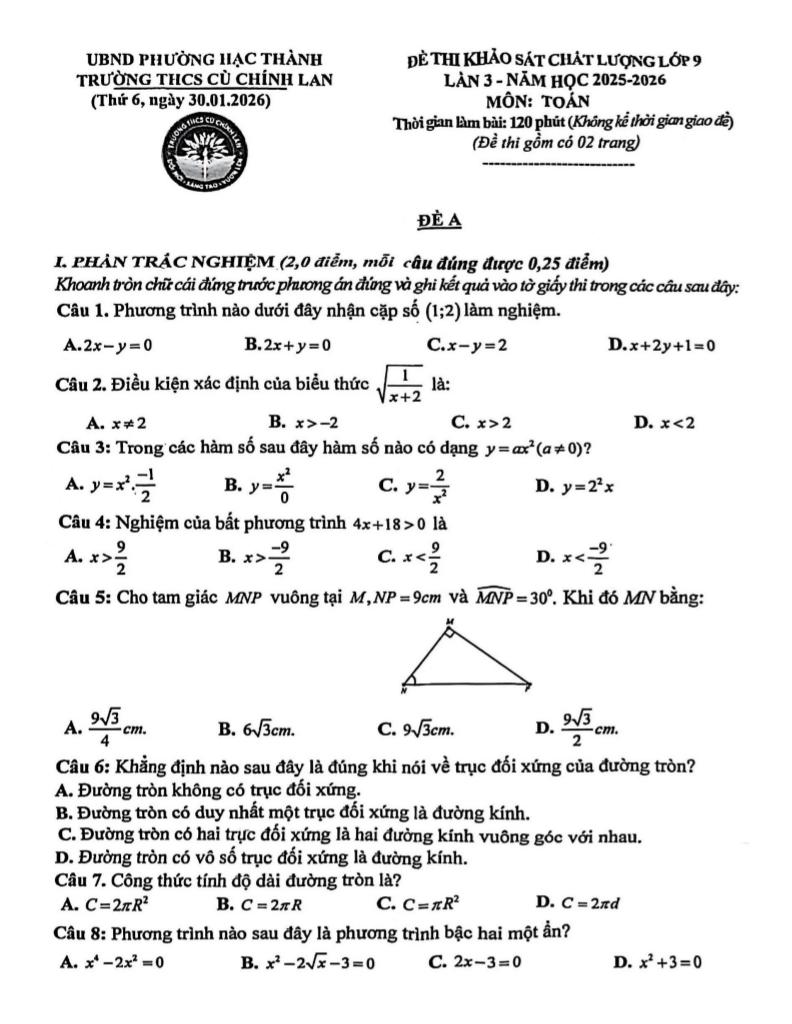 Trích dẫn Đề khảo sát Toán 9 lần 3 năm 2025 – 2026 trường THCS Cù Chính Lan – Thanh Hóa: