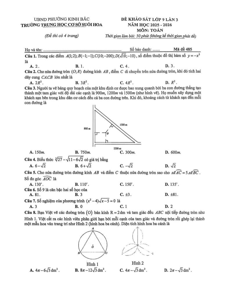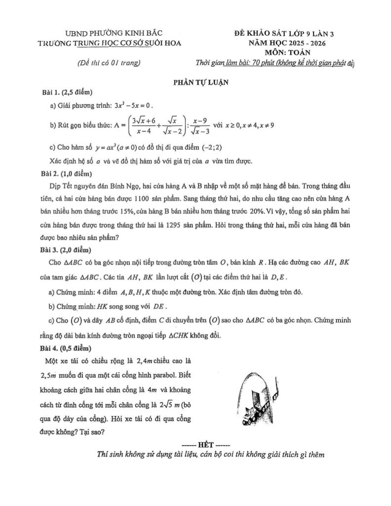 Trích dẫn Đề khảo sát Toán 9 lần 3 năm 2025 – 2026 trường THCS Suối Hoa – Bắc Ninh: