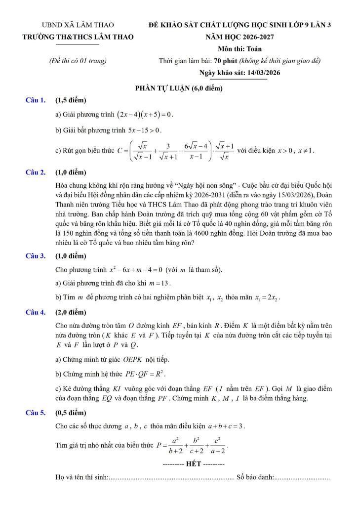 Trích dẫn Đề khảo sát Toán 9 lần 3 năm 2026 trường TH&THCS Lâm Thao – Bắc Ninh: