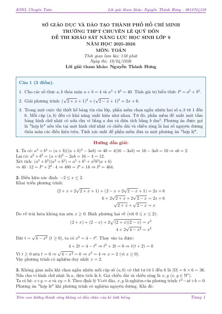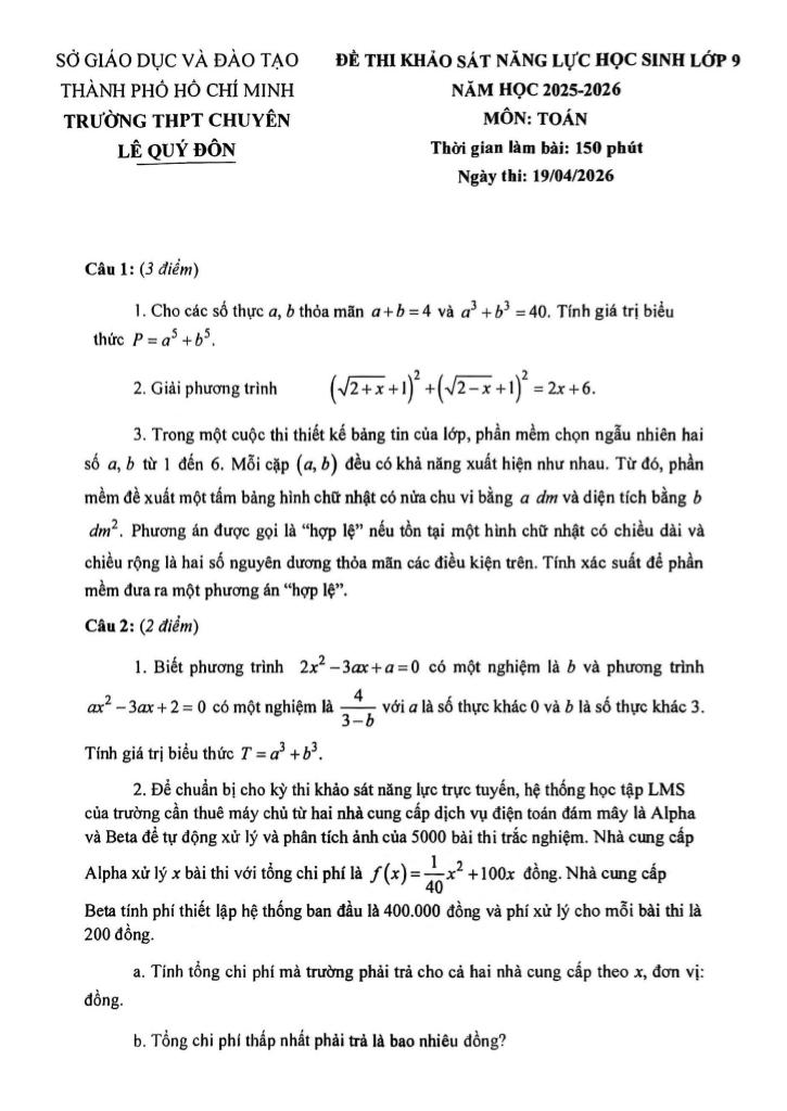 Trích dẫn Đề khảo sát Toán 9 năm 2025 – 2026 trường THPT chuyên Lê Quý Đôn – TP HCM: