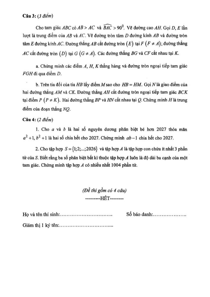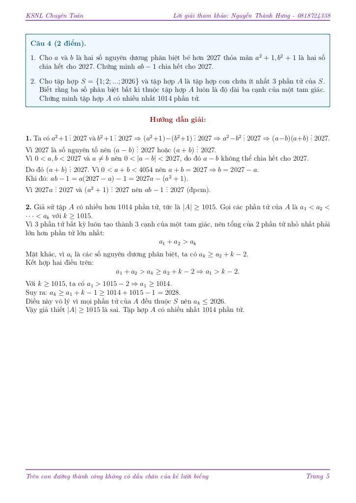 + Cho tập hợp S = {1; 2; …; 2026} và tập hợp A là tập hợp con chứa ít nhất 3 phần tử của S. Biết rằng ba số phân biệt bất kì thuộc tập hợp A luôn là độ dài ba cạnh của một tam giác. Chứng minh tập hợp A có nhiều nhất 1004 phần tử.