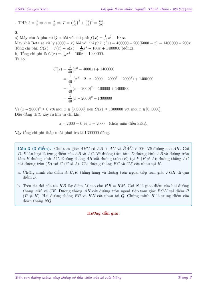 + Để chuẩn bị cho kỳ thi khảo sát năng lực trực tuyến, hệ thống học tập LMS của trường cần thuê máy chủ từ hai nhà cung cấp dịch vụ điện toán đám mây là Alpha và Beta để tự động xử lý và phân tích ảnh của 5000 bài thi trắc nghiệm. Nhà cung cấp Alpha xử lý x bài thi với tổng chi phí là f(x) = 1/40x² + 100x đồng. Nhà cung cấp Beta tính phí thiết lập hệ thống ban đầu là 400.000 đồng và phí xử lý cho mỗi bài thi là 200 đồng. a. Tính tổng chi phí mà trường phải trả cho cả hai nhà cung cấp theo x (đơn vị: đồng). b. Tổng chi phí thấp nhất phải trả là bao nhiêu đồng?