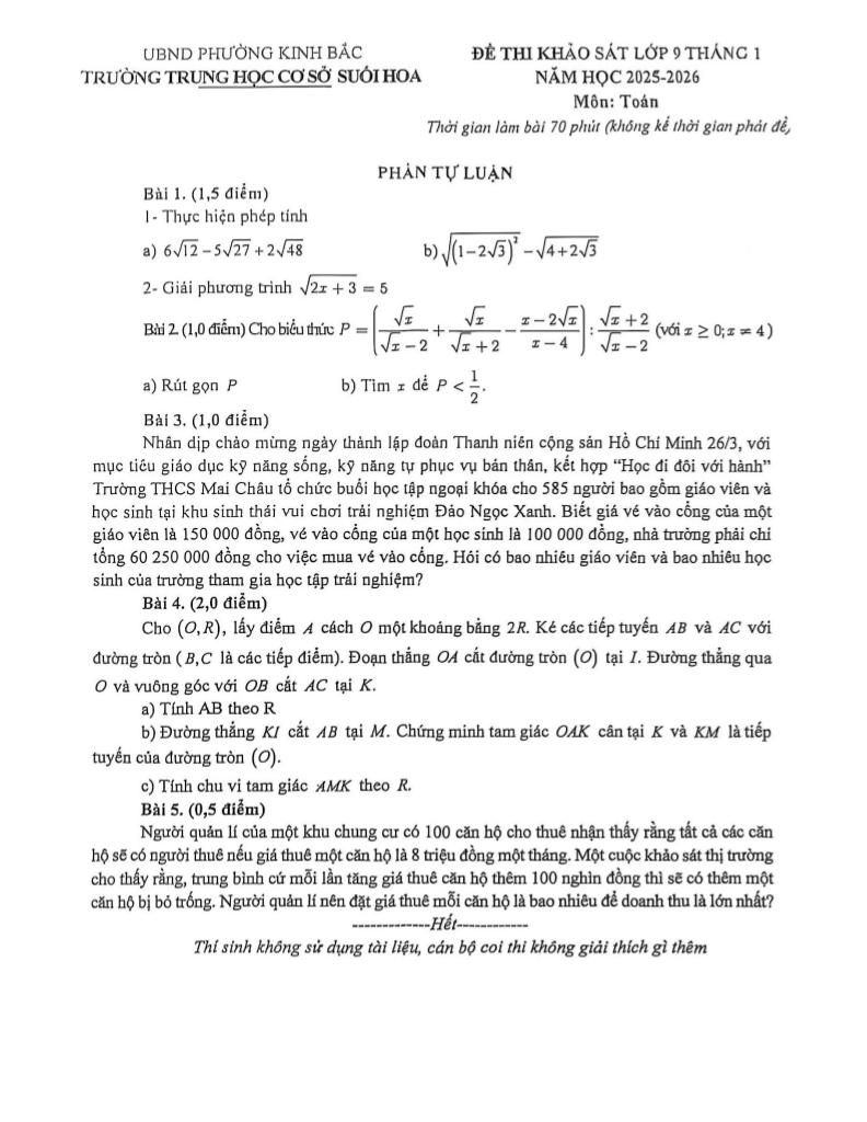 Trích dẫn Đề khảo sát Toán 9 tháng 1 năm 2026 trường THCS Suối Hoa – Bắc Ninh: