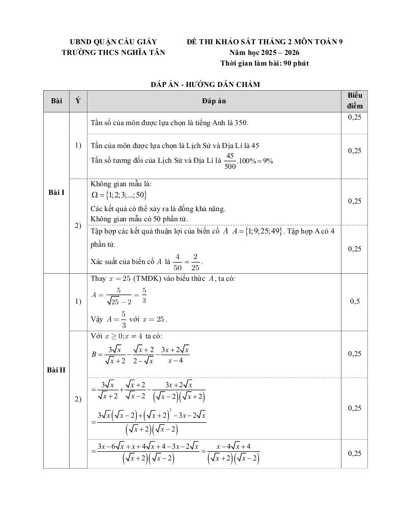 Trích dẫn Đề khảo sát Toán 9 tháng 2 năm 2026 trường THCS Nghĩa Tân – Hà Nội: