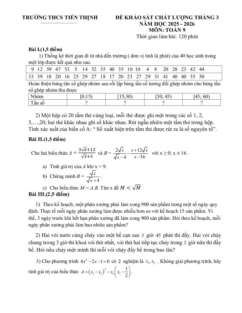 Trích dẫn Đề khảo sát Toán 9 tháng 3 năm 2026 trường THCS Tiến Thịnh – Hà Nội: