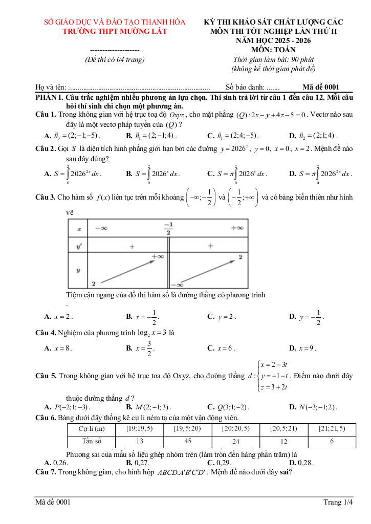 Trích dẫn Đề khảo sát Toán thi TN THPT 2026 lần 2 trường THPT Mường Lát – Thanh Hóa: