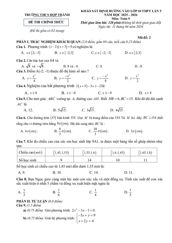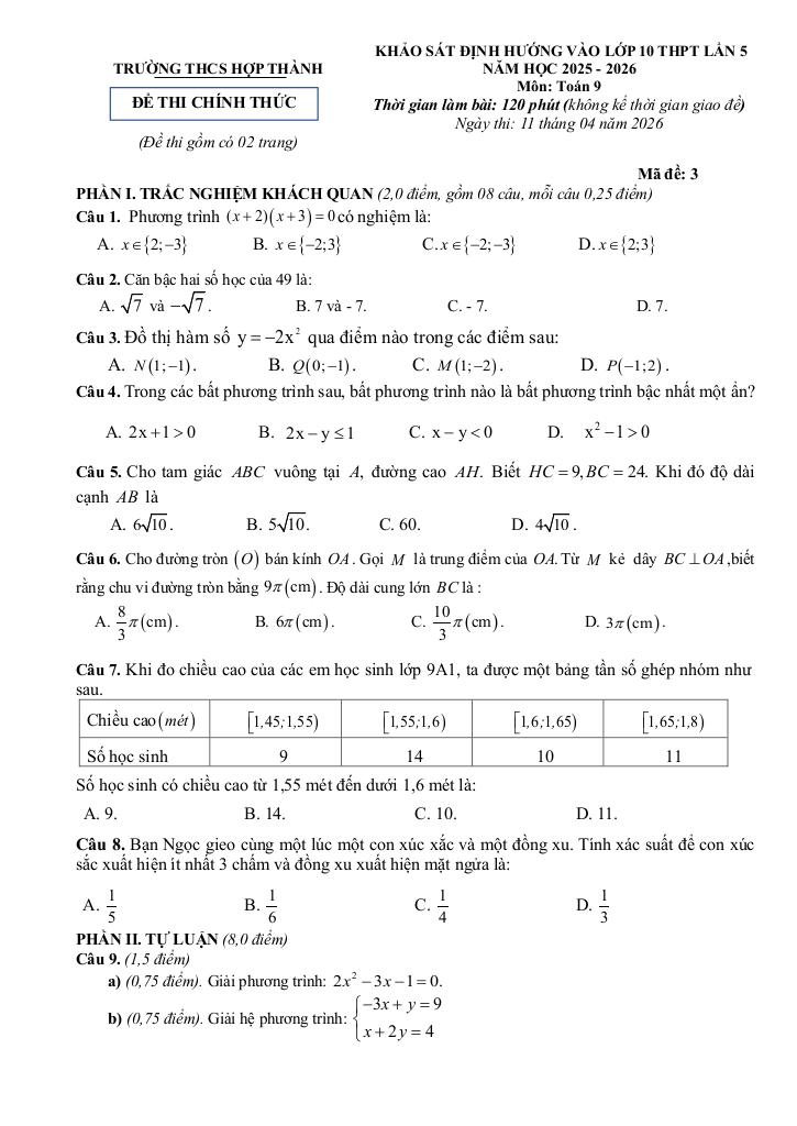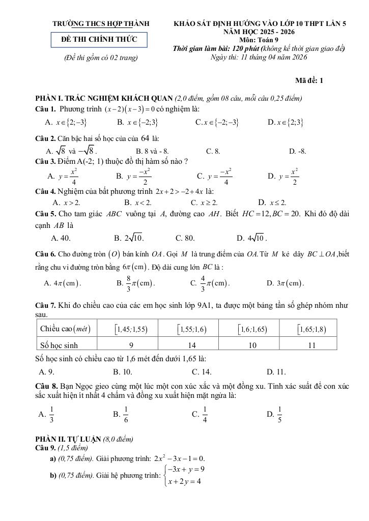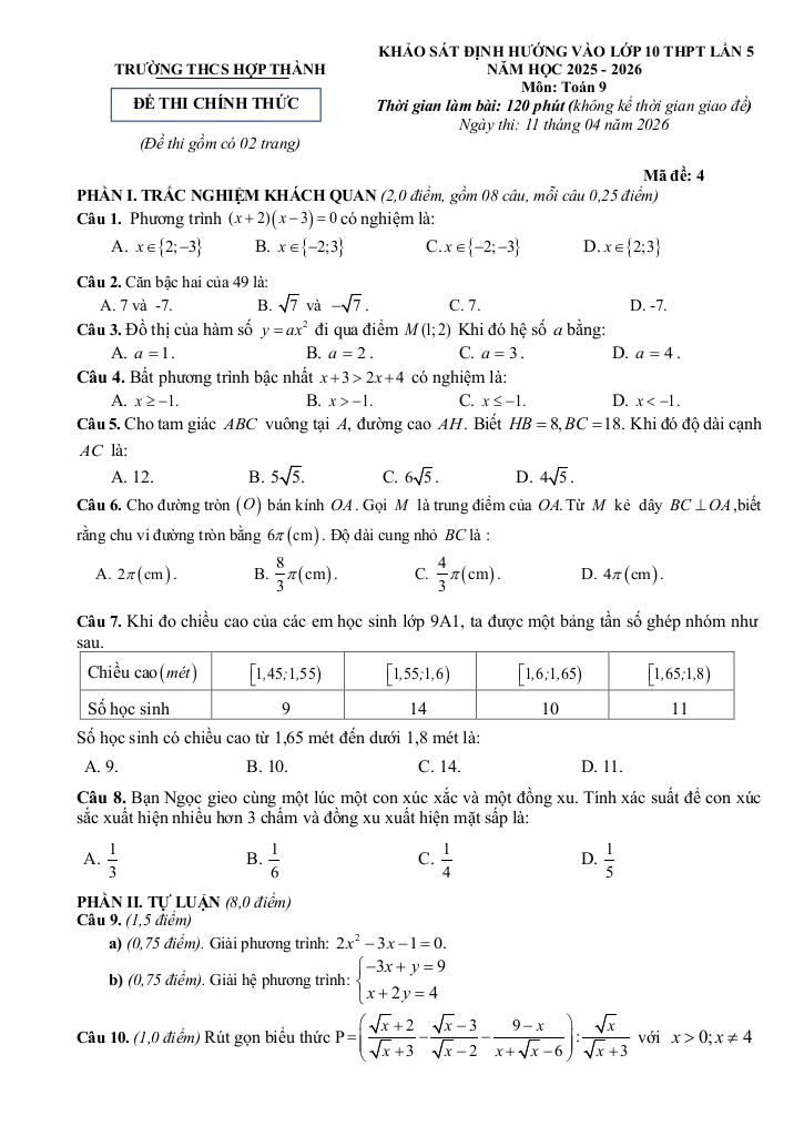 Trích dẫn Đề khảo sát vào lớp 10 môn Toán lần 5 năm 2026 trường THCS Hợp Thành – Thanh Hóa: