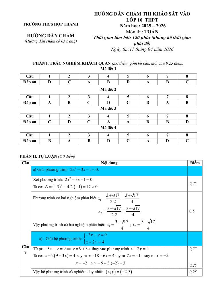 Giải Toán đề khảo sát vào lớp 10 môn toán lần 5 năm 2026 trường thcs hợp thành – thanh hóa với Đáp Án Mới Nhất