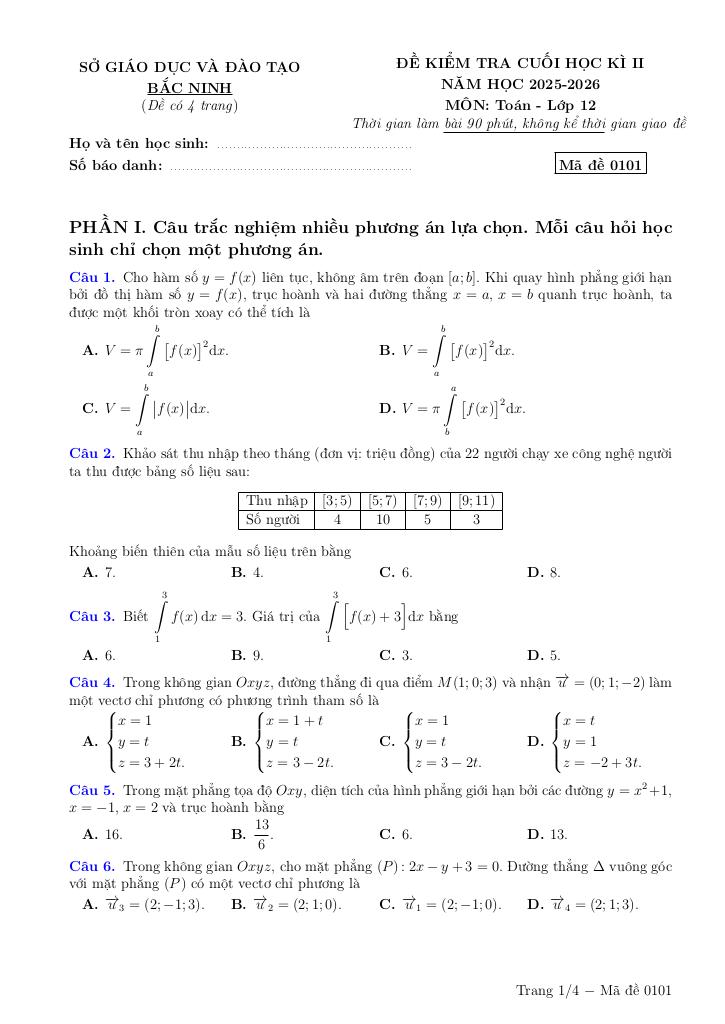 giaitoan.edu.vn giới thiệu đến quý thầy, cô giáo và các em học sinh đề kiểm tra cuối học kì 2 môn Toán 12 năm học 2025 – 2026 sở Giáo dục và Đào tạo tỉnh Bắc Ninh. Đề thi gồm 12 câu trắc nghiệm nhiều phương án lựa chọn (3,0 điểm) + 04 câu trắc nghiệm đúng sai (4,0 điểm) + 06 câu trắc nghiệm trả lời ngắn (3,0 điểm), thời gian làm bài 90 phút, có đáp án mã đề 0101 – 0102 – 0103 – 0104. Kỳ thi được diễn ra vào ngày 15 tháng 04 năm 2026.
