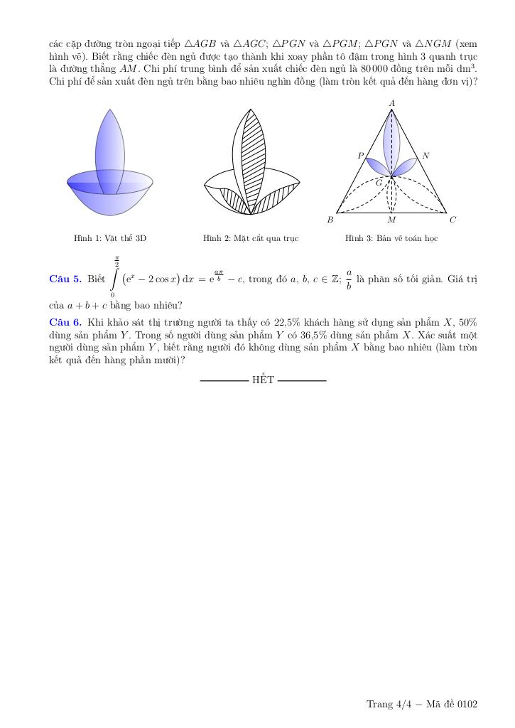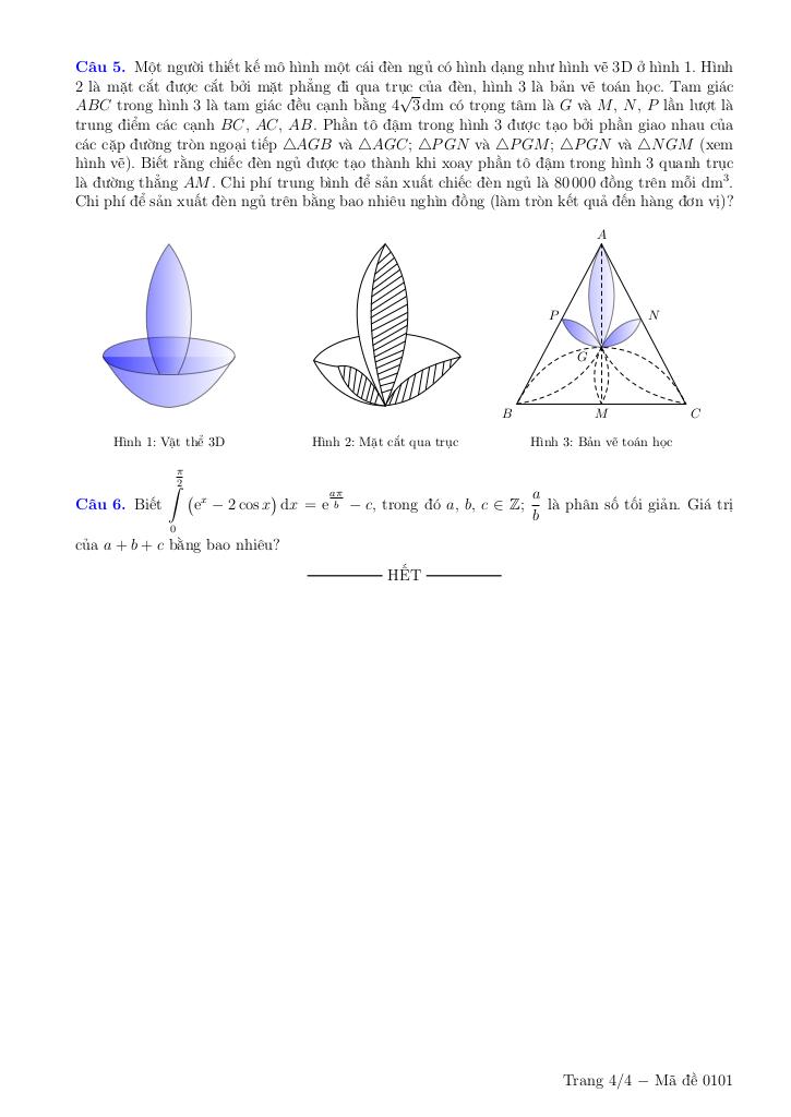 + Một người thiết kế mô hình một cái đèn ngủ có hình dạng như hình vẽ 3D ở hình 1. Hình 2 là mặt cắt được cắt bởi mặt phẳng đi qua trục của đèn, hình 3 là bản vẽ toán học. Tam giác ABC trong hình 3 là tam giác đều cạnh bằng 4√3 dm có trọng tâm là G và M, N, P lần lượt là trung điểm các cạnh BC, AC, AB. Phần tô đậm trong hình 3 được tạo bởi phần giao nhau của các cặp đường tròn ngoại tiếp △AGB và △AGC; △P GN và △P GM; △P GN và △NGM (xem hình vẽ). Biết rằng chiếc đèn ngủ được tạo thành khi xoay phần tô đậm trong hình 3 quanh trục là đường thẳng AM. Chi phí trung bình để sản xuất chiếc đèn ngủ là 80 000 đồng trên mỗi dm3. Chi phí để sản xuất đèn ngủ trên bằng bao nhiêu nghìn đồng (làm tròn kết quả đến hàng đơn vị)?