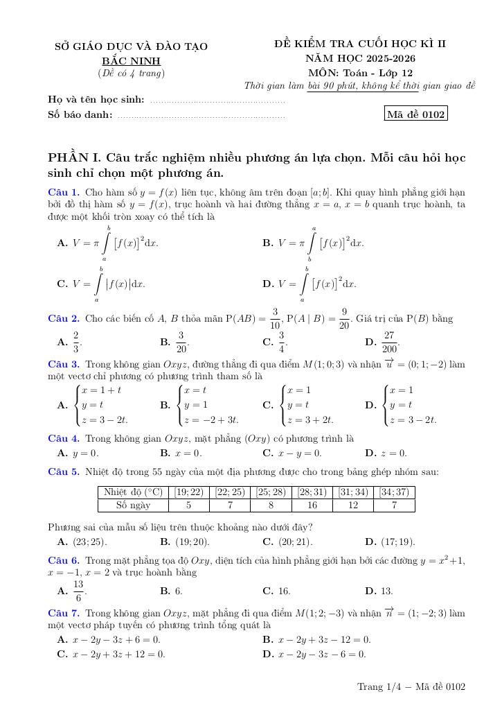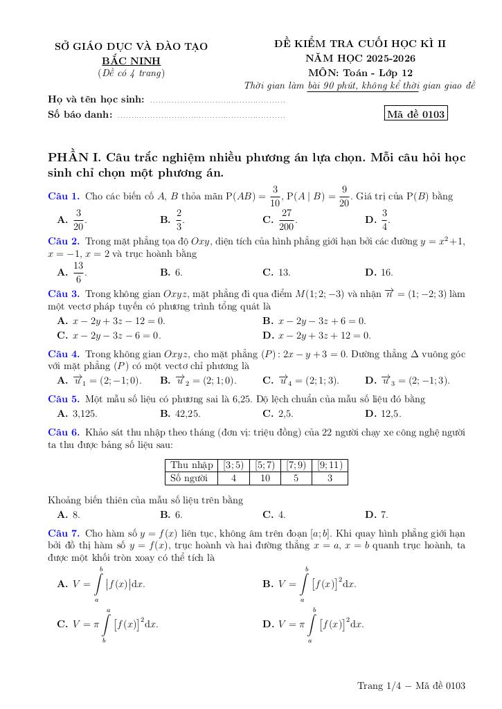Toán học luôn là một môn học quan trọng, giúp học sinh phát triển tư duy logic và kỹ năng giải quyết vấn đề. Để hỗ trợ các bạn học sinh và giáo viên trong việc học tập và giảng dạy, bài viết này sẽ cung cấp lời giải chi tiết và đáp án chính xác cho chủ đề đề kiểm tra cuối học kì 2 toán 12 năm 2025 – 2026 sở gd&đt bắc ninh, giúp bạn hiểu sâu và tự tin hơn khi làm bài tập.
