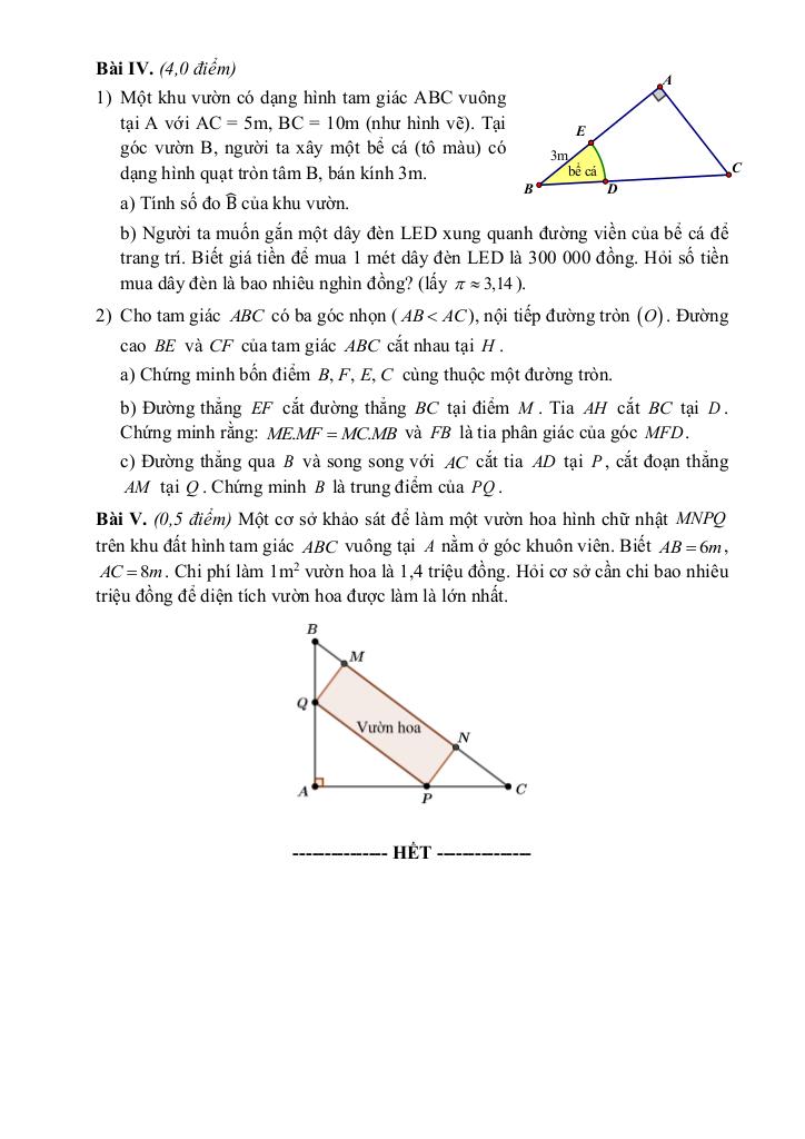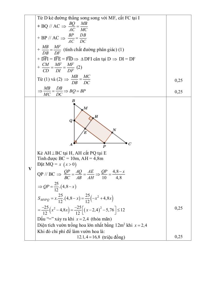 + Một cơ sở khảo sát để làm một vườn hoa hình chữ nhật MNPQ trên khu đất hình tam giác ABC vuông tại A nằm ở góc khuôn viên. Biết AB = 6m, AC = 8m. Chi phí làm 1m2 vườn hoa là 1,4 triệu đồng. Hỏi cơ sở cần chi bao nhiêu triệu đồng để diện tích vườn hoa được làm là lớn nhất.