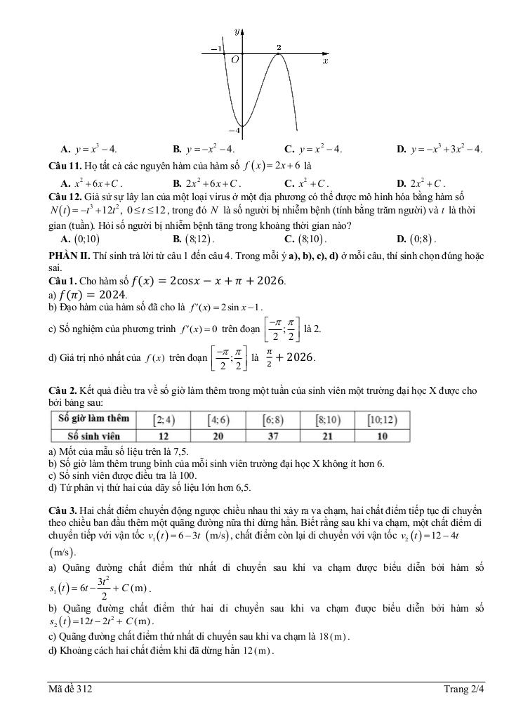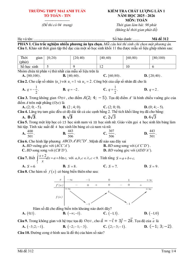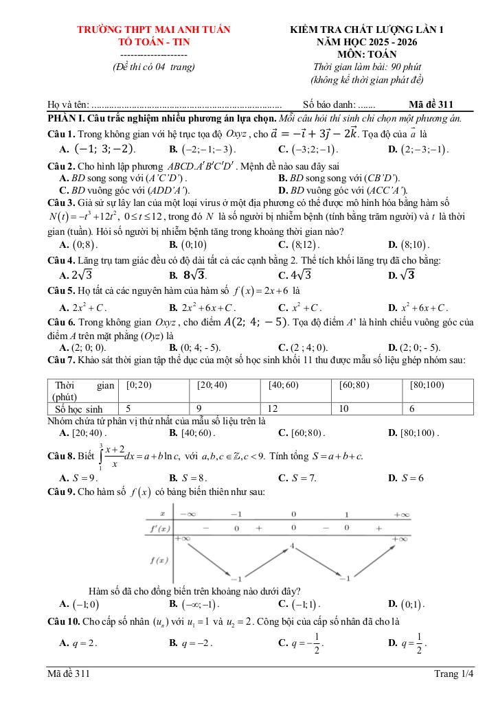 giaitoan.edu.vn giới thiệu đến quý thầy, cô giáo và các em học sinh đề kiểm tra chất lượng lần 1 môn Toán 12 năm học 2025 – 2026 trường THPT Mai Anh Tuấn, tỉnh Thanh Hóa. Đề thi gồm 12 câu trắc nghiệm nhiều phương án lựa chọn (3,0 điểm) + 04 câu trắc nghiệm đúng sai (4,0 điểm) + 06 câu trắc nghiệm trả lời ngắn (3,0 điểm), thời gian làm bài 90 phút, có đáp án và lời giải chi tiết mã đề 311 – 312.