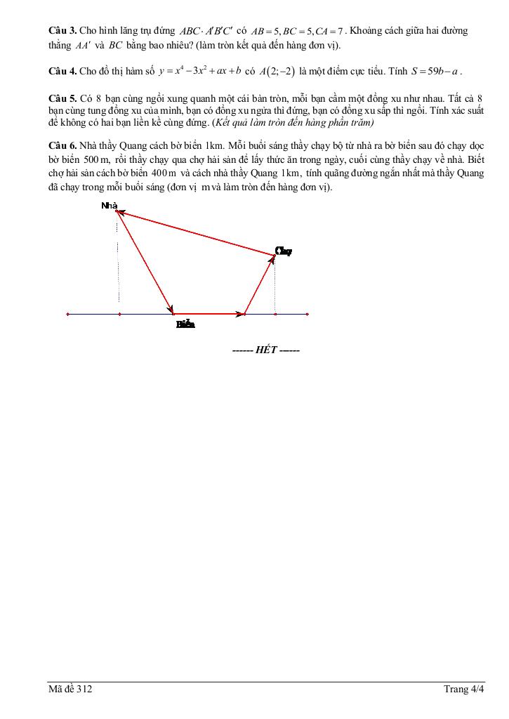 + Nhà thầy Quang cách bờ biển 1km. Mỗi buổi sáng thầy chạy bộ từ nhà ra bờ biển sau đó chạy dọc bờ biển 500 m, rồi thầy chạy qua chợ hải sản để lấy thức ăn trong ngày, cuối cùng thầy chạy về nhà. Biết chợ hải sản cách bờ biển 400 m và cách nhà thầy Quang 1km, tính quãng đường ngắn nhất mà thầy Quang đã chạy trong mỗi buổi sáng (đơn vị m và làm tròn đến hàng đơn vị).