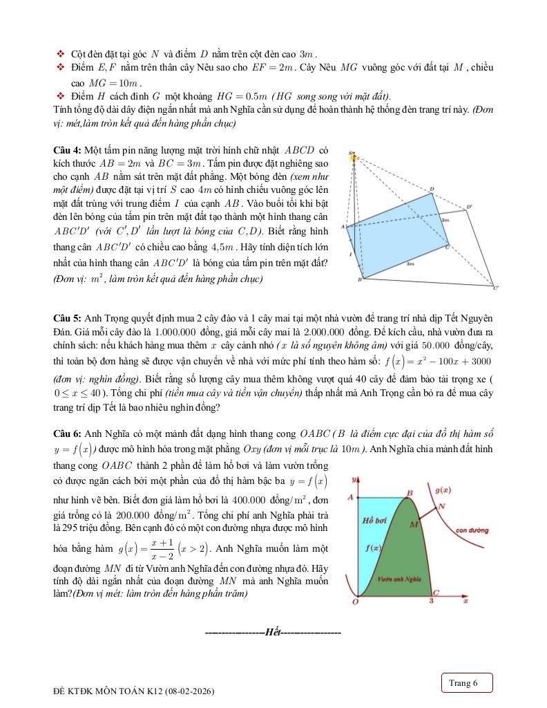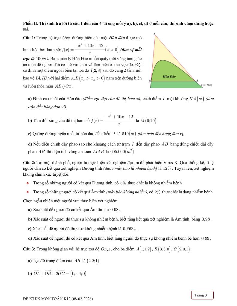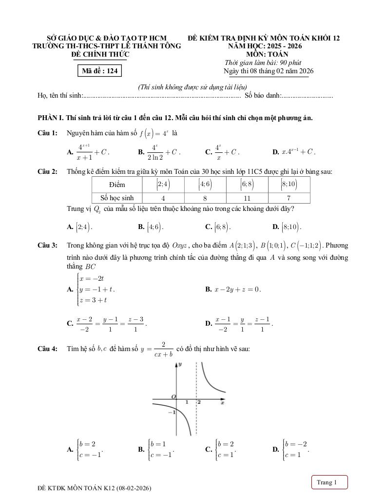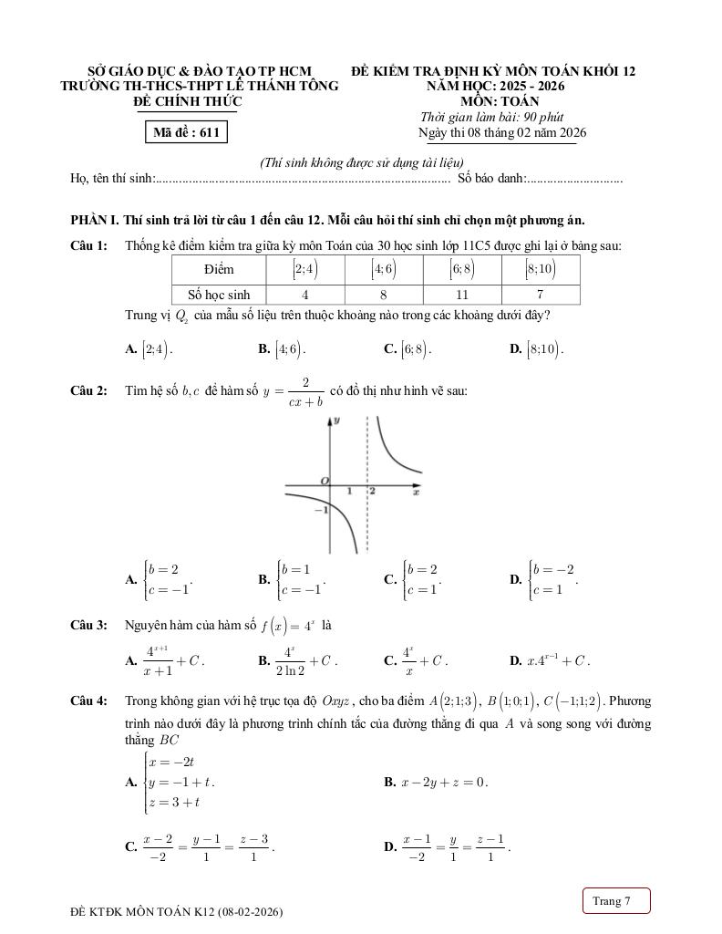 Trích dẫn Đề kiểm tra Toán 12 tháng 2 năm 2026 trường Lê Thánh Tông – TP HCM: