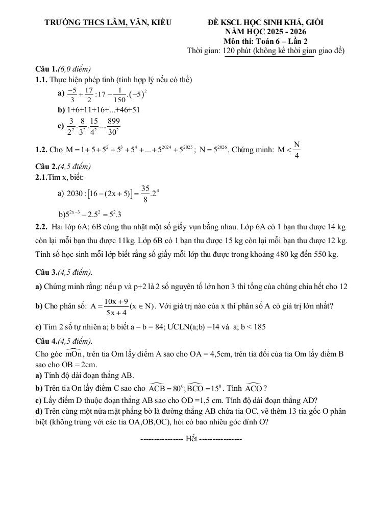 Trích dẫn Đề KSCL học sinh giỏi Toán 6 lần 2 năm 2025 – 2026 cụm THCS Lâm-Văn-Kiều – Nghệ An: