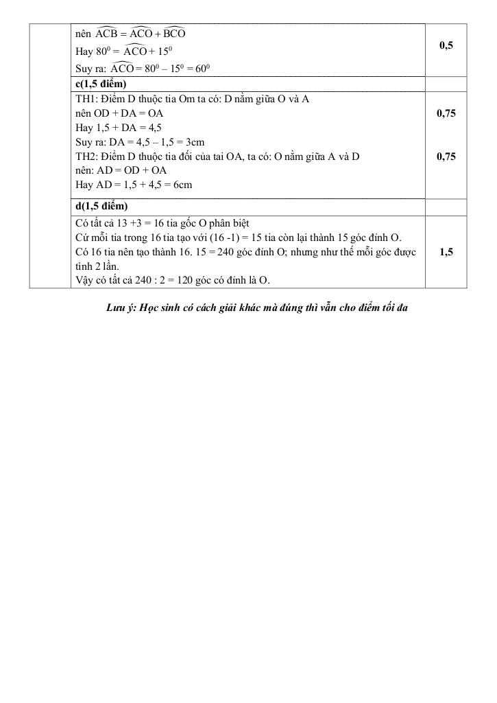 + Cho góc mOn, trên tia Om lấy điểm A sao cho OA = 4,5cm, trên tia đối của tia Om lấy điểm B sao cho OB = 2cm. a) Tính độ dài đoạn thẳng AB. b) Trên tia On lấy điểm C sao cho ACB = 80; BCO = 15. Tính ACO? c) Lấy điểm D thuộc đoạn thẳng AB sao cho OD = 1,5 cm. Tính độ dài đoạn thẳng AD? d) Trên cùng một nửa mặt phẳng bờ là đường thẳng AB chứa tia OC, vẽ thêm 13 tia gốc O phân biệt (không trùng với các tia OA, OB, OC), hỏi có bao nhiêu góc đỉnh O?