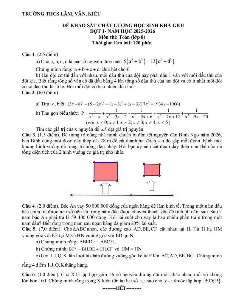 Trích dẫn Đề KSCL học sinh giỏi Toán 8 đợt 1 năm 2025 – 2026 cụm THCS Lâm-Văn-Kiều – Nghệ An: