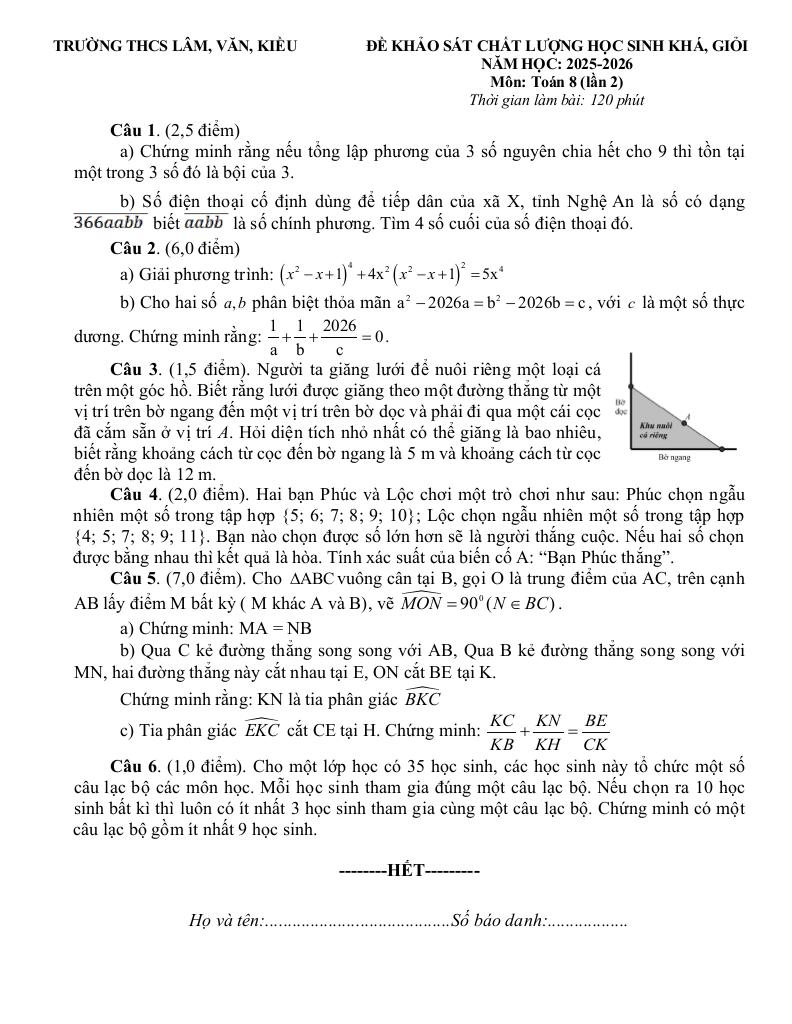 Trích dẫn Đề KSCL học sinh giỏi Toán 8 lần 2 năm 2025 – 2026 cụm THCS Lâm-Văn-Kiều – Nghệ An: