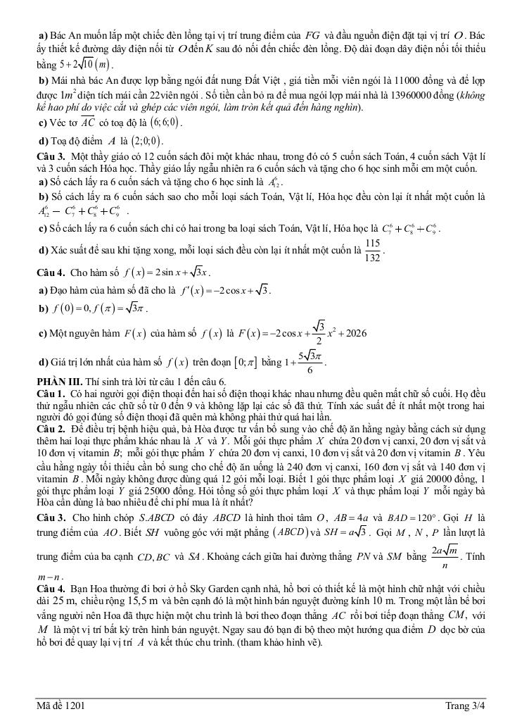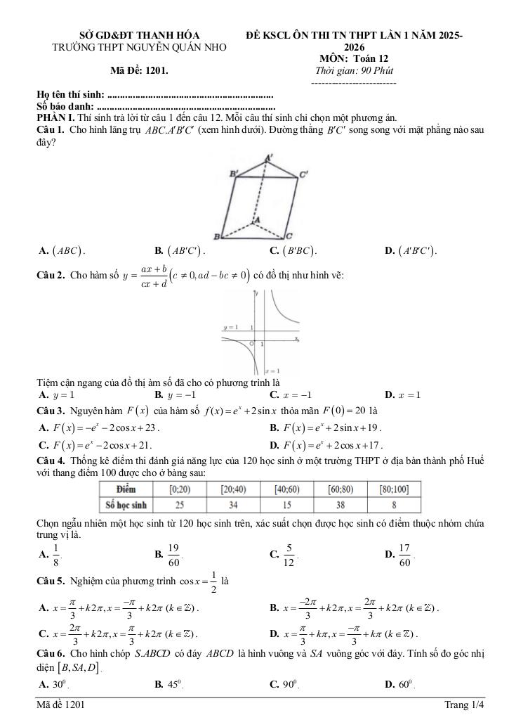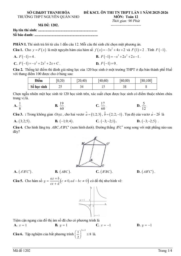 Trích dẫn Đề KSCL Toán 12 thi TN THPT 2026 lần 1 trường THPT Nguyễn Quán Nho – Thanh Hóa: