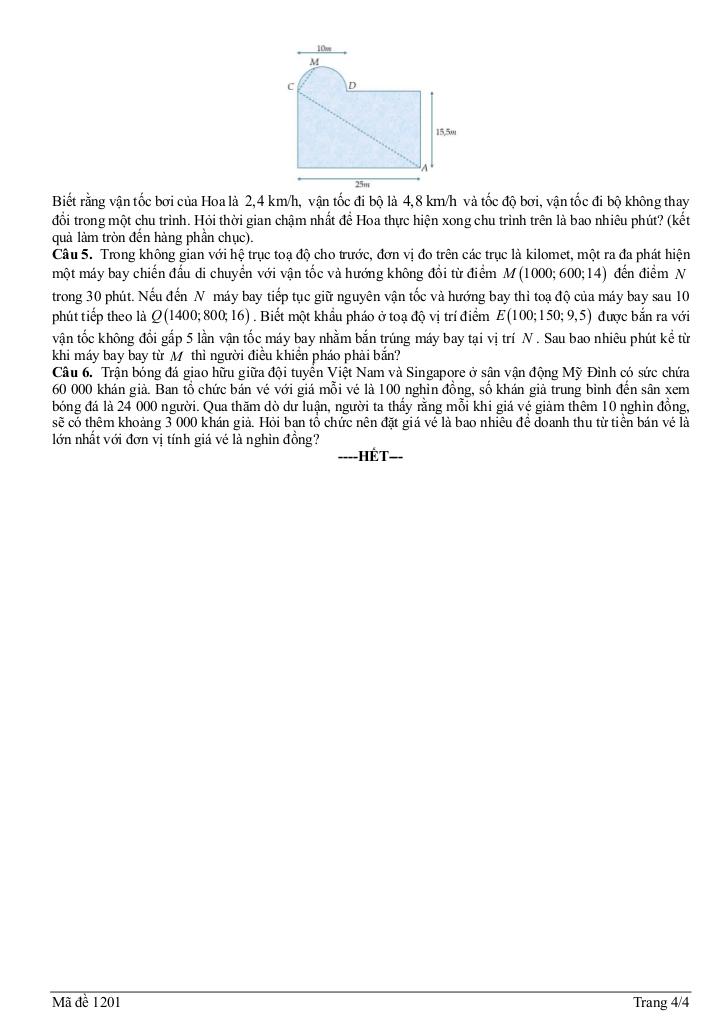 + Bạn Hoa thường đi bơi ở hồ Sky Garden cạnh nhà, hồ bơi có thiết kế là một hình chữ nhật với chiều dài 25 m, chiều rộng 15,5 m và bên cạnh đó là một hình bán nguyệt đường kính 10 m. Trong một lần bể bơi vắng người nên Hoa đã thực hiện một chu trình là bơi theo đoạn thẳng AC rồi bơi tiếp đoạn thẳng CM, với M là một vị trí bất kỳ trên hình bán nguyệt. Ngay sau đó bạn đi bộ theo một hướng qua điểm D dọc bờ của hồ bơi để quay lại vị trí A và kết thúc chu trình. (tham khảo hình vẽ). Biết rằng vận tốc bơi của Hoa là 2,4 km/h, vận tốc đi bộ là 4,8 km/h và tốc độ bơi, vận tốc đi bộ không thay đổi trong một chu trình. Hỏi thời gian chậm nhất để Hoa thực hiện xong chu trình trên là bao nhiêu phút? (kết quả làm tròn đến hàng phần chục).