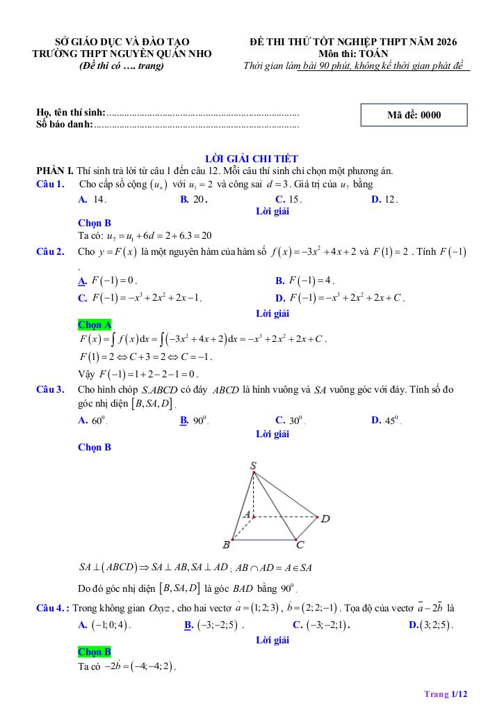 Giải Toán đề kscl toán 12 thi tn thpt 2026 lần 1 trường thpt nguyễn quán nho – thanh hóa với Đáp Án Mới Nhất
