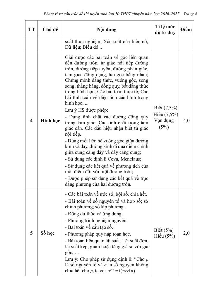 Lưu ý: Các chủ đề/nội dung trong đề thi chính thức có thể gia giảm so với phạm vi kiến thức bên trên một cách thích hợp nhưng phải bảo đảm đủ các thành phần của năng lực và theo mức độ tư duy được quy định trong Chương trình Giáo dục phổ thông 2018 với tỉ lệ: 40% biết, 40% hiểu và 20% vận dụng.