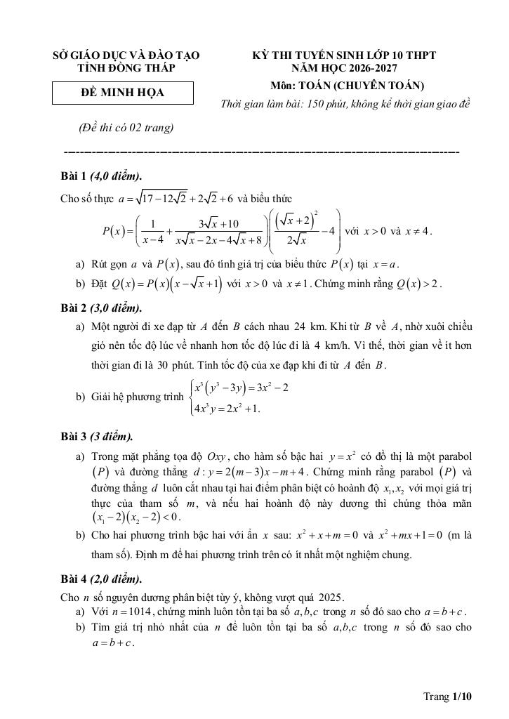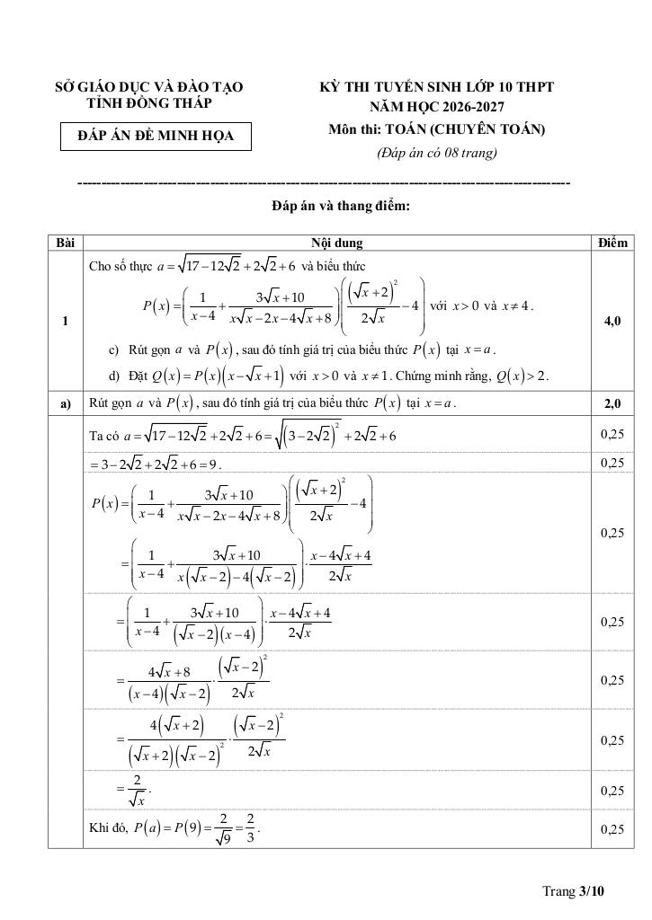 Giải Toán đề minh họa tuyển sinh lớp 10 môn toán (chuyên) năm 2026 – 2027 sở gd&đt đồng tháp với Đáp Án Mới Nhất