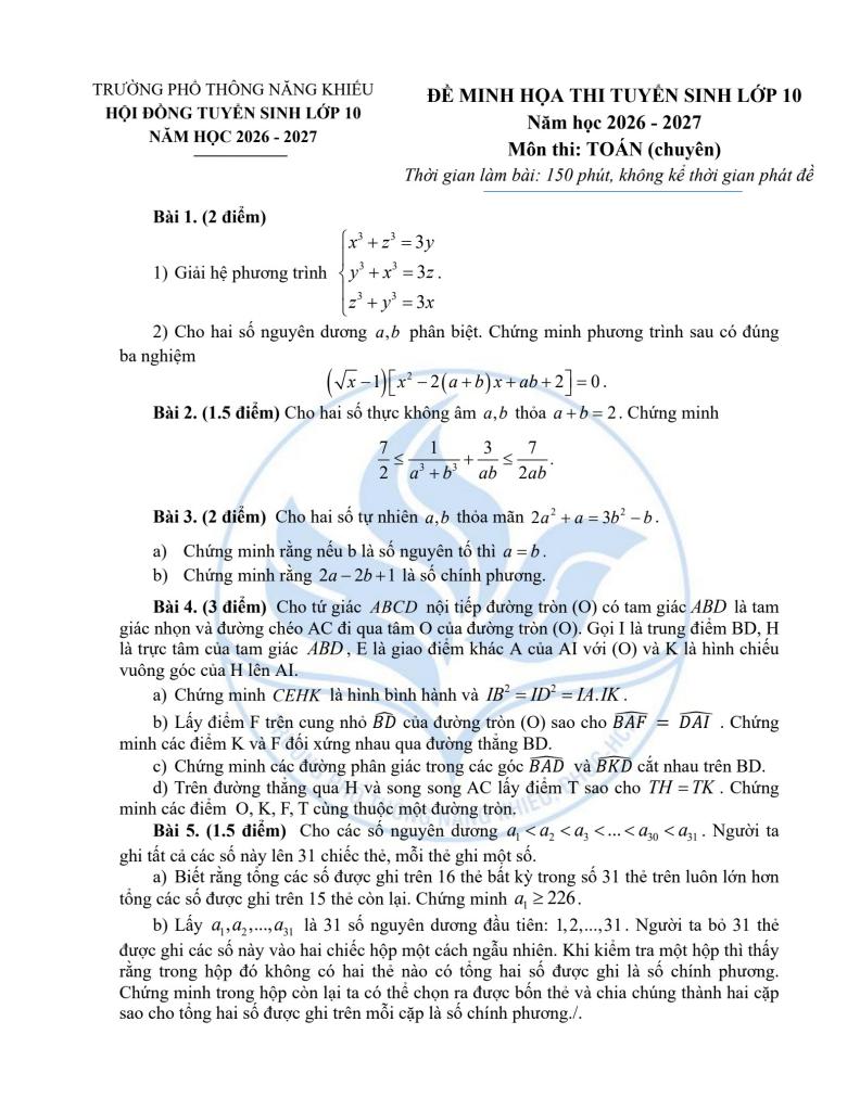 Giải Toán đề minh họa tuyển sinh lớp 10 môn toán (chuyên) năm 2026 – 2027 trường ptnk – tp hcm với Đáp Án Mới Nhất