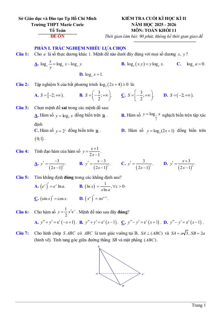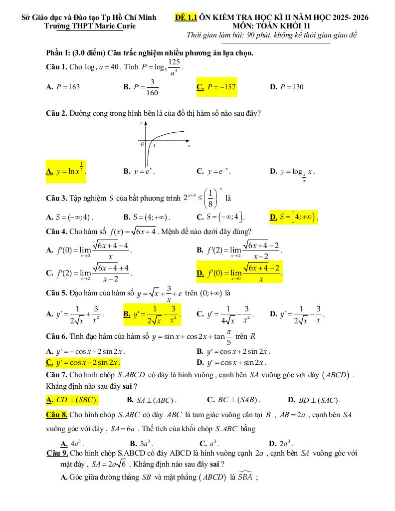 Trích dẫn Đề ôn tập cuối kì 2 Toán 11 năm 2025 – 2026 trường THPT Marie Curie – TP HCM: