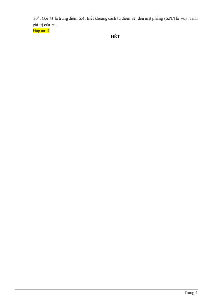 + Cho hình chóp giaitoan.edu.vn có ABCD là hình chữ nhật cạnh AB = 16a và O là giao điểm hai đường chéo, biết các cạnh bên của hình chóp bằng nhau và góc giữa mặt bên (SAD) và mặt đáy bằng 30. Gọi M là trung điểm SA. Biết khoảng cách từ điểm M đến mặt phẳng (SBC) là ma. Tính giá trị của m.