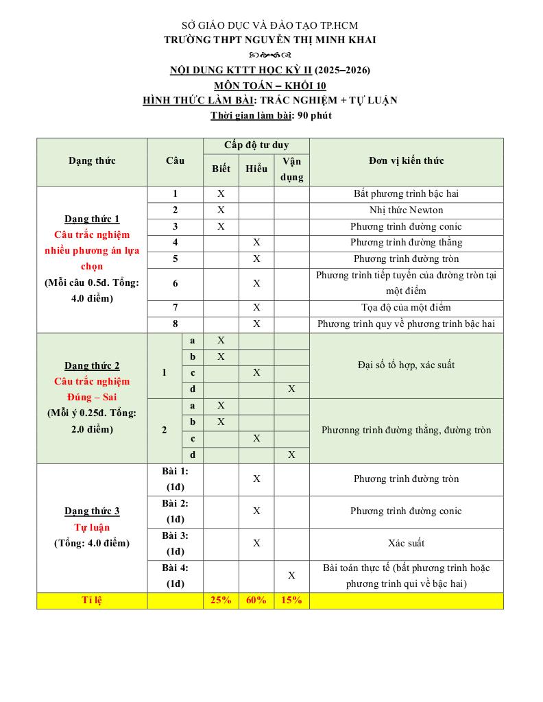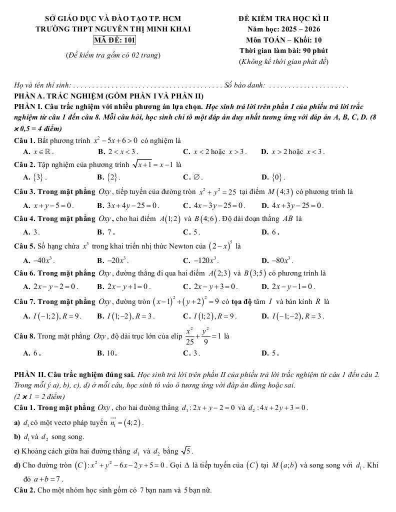 giaitoan.edu.vn giới thiệu đến quý thầy, cô giáo và các em học sinh đề ôn tập kiểm tra cuối học kỳ 2 môn Toán 10 năm học 2025 – 2026 trường THPT Nguyễn Thị Minh Khai, thành phố Hồ Chí Minh.