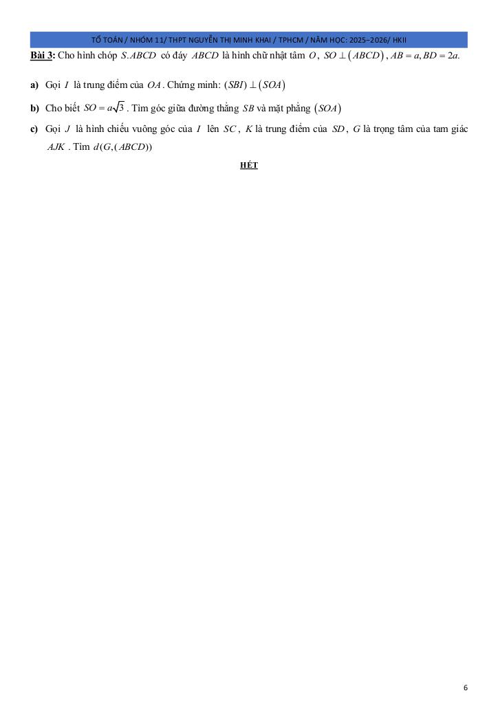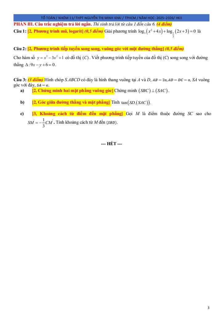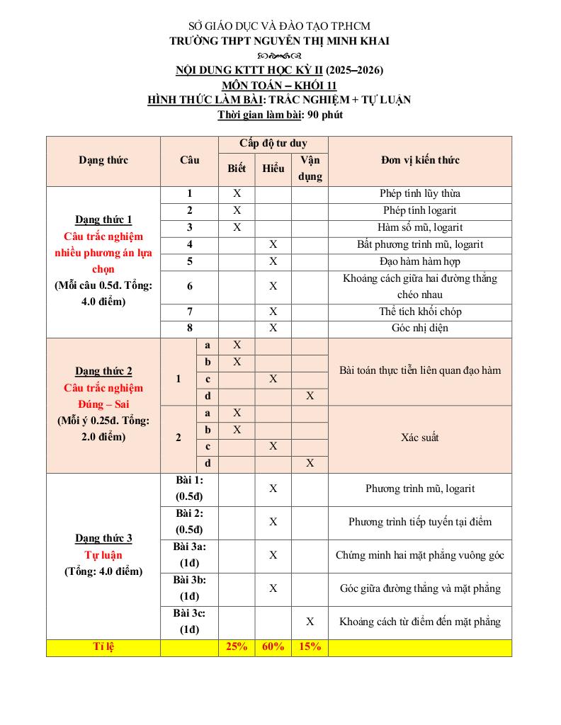 giaitoan.edu.vn giới thiệu đến quý thầy, cô giáo và các em học sinh đề ôn tập kiểm tra cuối học kỳ 2 môn Toán 11 năm học 2025 – 2026 trường THPT Nguyễn Thị Minh Khai, thành phố Hồ Chí Minh.